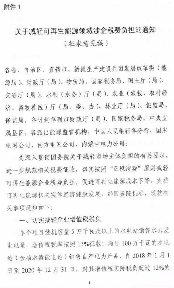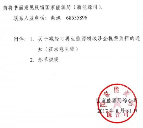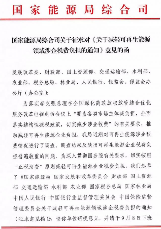國(guó)家能源局下發(fā)關(guān)于征求對(duì)《關(guān)于減輕可再生能源領(lǐng)域涉企稅費(fèi)負(fù)擔(dān)的通知》意見(jiàn)的函 |