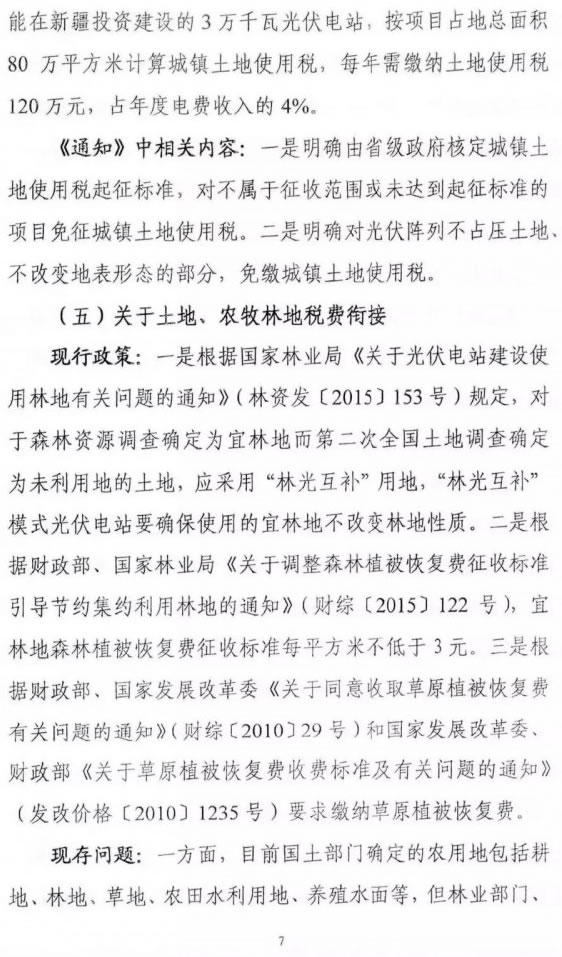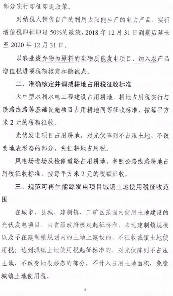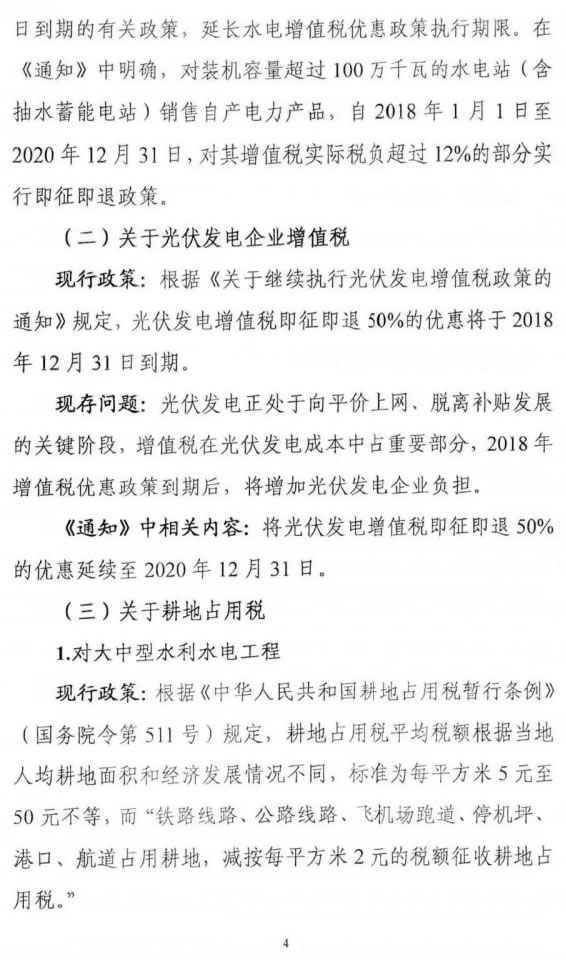 近日,國(guó)家能源局綜合司下發(fā)了關(guān)于征求對(duì)《關(guān)于減輕可再生能源領(lǐng)域涉企稅費(fèi)負(fù)擔(dān)的通知》(以下簡(jiǎn)稱《通知》)意見(jiàn)的函。為切實(shí)減輕可再生能源企業(yè)增值稅稅負(fù),《通知》強(qiáng)調(diào),對(duì)納稅人銷售自產(chǎn)的利用太陽(yáng)能生產(chǎn)的電力產(chǎn)品,實(shí)行增值稅即征即退50%的政策,從2018年12月31日延長(zhǎng)到2020年12月31日。 值得注意的是,《通知》明確,各地方政府一律不得向可再生能源投資企業(yè)收取沒(méi)有法律依據(jù)的資源出讓費(fèi)等費(fèi)用,不得將應(yīng)由各級(jí)政府承擔(dān)投資責(zé)任的社會(huì)公益事業(yè)投資轉(zhuǎn)嫁給可再生能源投資企業(yè)或向其分?jǐn)?,不?yīng)強(qiáng)行要求可再生能源投資企業(yè)提取收益扶貧。已經(jīng)向風(fēng)電、光伏發(fā)電、光熱發(fā)電等可再生能源開發(fā)投資項(xiàng)目收取資源出讓費(fèi)(或有償配置項(xiàng)目)的地方政府,應(yīng)在通知發(fā)布一年內(nèi)完成清退。 此外,《通知》中指出,各類可再生能源發(fā)電項(xiàng)目的外部配套及輸配電工程,全部由所在地電網(wǎng)企業(yè)投資建設(shè),以往相關(guān)電網(wǎng)工程由可再生能源發(fā)電項(xiàng)目單位投資建設(shè)的,電網(wǎng)企業(yè)按協(xié)議或經(jīng)第三方評(píng)估在兩年內(nèi)完成回購(gòu)。電網(wǎng)企業(yè)配套可再生能源項(xiàng)目的接網(wǎng)及輸配電工程全部計(jì)入所在省級(jí)電網(wǎng)輸配電價(jià)核定的成本范圍。 針對(duì)光伏企業(yè),《通知》規(guī)定:1、光伏發(fā)電產(chǎn)品增值稅即征即退50%的政策,從2018年12月31日延長(zhǎng)到2020年12月31日;2、光伏發(fā)電項(xiàng)目占用耕地,對(duì)光伏陣列不占?jí)和恋亍⒉桓淖兊乇硇螒B(tài)的部分,免征征地占用稅;3、在城市、縣城、建制鎮(zhèn)、工礦區(qū)范圍內(nèi)使用土地建設(shè)的光伏發(fā)電項(xiàng)目,由省級(jí)政府核定起征標(biāo)準(zhǔn),偉大建制鎮(zhèn)規(guī)模以及不在建制鎮(zhèn)規(guī)劃內(nèi)的土地上建設(shè)的,不征收城鎮(zhèn)土地使用稅;達(dá)到城鎮(zhèn)土地使用稅起征標(biāo)準(zhǔn)的,對(duì)光伏陣列不占?jí)和恋?、不改變地表形態(tài)的部分,不計(jì)入占用土地面積,免繳城鎮(zhèn)土地使用稅。4、各類可再生能源發(fā)電項(xiàng)目的外部配套及輸配電工程,全部由所在地電網(wǎng)企業(yè)投資建設(shè),以往相關(guān)電網(wǎng)工程由可再生能源發(fā)電項(xiàng)目單位投資建設(shè)的,電網(wǎng)企業(yè)按協(xié)議或經(jīng)第三方評(píng)估在兩年內(nèi)完成回購(gòu)。電網(wǎng)企業(yè)配套可再生能源項(xiàng)目的接網(wǎng)及輸配電工程全部計(jì)入所在省級(jí)電網(wǎng)輸配電價(jià)核定的成本范圍。5、各地要鼓勵(lì)銀行等金融機(jī)構(gòu)降低貸款利率,對(duì)達(dá)到優(yōu)質(zhì)信貸等級(jí)的可再生能源項(xiàng)目投資企業(yè),鼓勵(lì)按基準(zhǔn)利率下浮10%左右的利率予以支持,并可對(duì)可再生能源發(fā)電項(xiàng)目適當(dāng)延長(zhǎng)貸款期限并給予還貸靈活性。 關(guān)于生物質(zhì)能發(fā)電的調(diào)整,《通知》指出:現(xiàn)行政策是根據(jù)財(cái)政部、國(guó)家稅務(wù)總局《關(guān)于在部分行業(yè)試行農(nóng)產(chǎn)品增值稅進(jìn)項(xiàng)稅額核定扣除辦法的通知》(財(cái)稅[2012]38號(hào))規(guī)定,以購(gòu)進(jìn)農(nóng)產(chǎn)品為原料生產(chǎn)銷售液體乳及乳制品、酒及酒精、植物油的增值稅一般為納稅人,納入農(nóng)產(chǎn)品增值稅進(jìn)項(xiàng)稅額核定扣除試點(diǎn)范圍。調(diào)研發(fā)現(xiàn),目前生物質(zhì)能項(xiàng)目燃料大部分通過(guò)經(jīng)紀(jì)人代理收購(gòu),直接收購(gòu)僅占一小部分。一方面,代開發(fā)票稅率較高,另一方面,直接收購(gòu)方式較難取得合格增值稅發(fā)票,導(dǎo)致增值稅抵扣具體落實(shí)存在困難?!锻ㄖ分邢嚓P(guān)內(nèi)容明確將生物質(zhì)能發(fā)電納入農(nóng)產(chǎn)品增值稅進(jìn)項(xiàng)稅額核定扣除試點(diǎn),有望起到改善作用。 為加快推動(dòng)建立綠色金融體系,降低企業(yè)融資成本,《通知》還強(qiáng)調(diào),各地要鼓勵(lì)銀行等金融機(jī)構(gòu)降低貸款利率,對(duì)達(dá)到優(yōu)質(zhì)信貸等級(jí)的可再生能源項(xiàng)目投資企業(yè),鼓勵(lì)按基準(zhǔn)利率下浮10%左右的利率予以支持,并可對(duì)可再生能源發(fā)電項(xiàng)目適當(dāng)延長(zhǎng)貸款期限并給予還貸靈活性。 以下為征求意見(jiàn)函原文:
