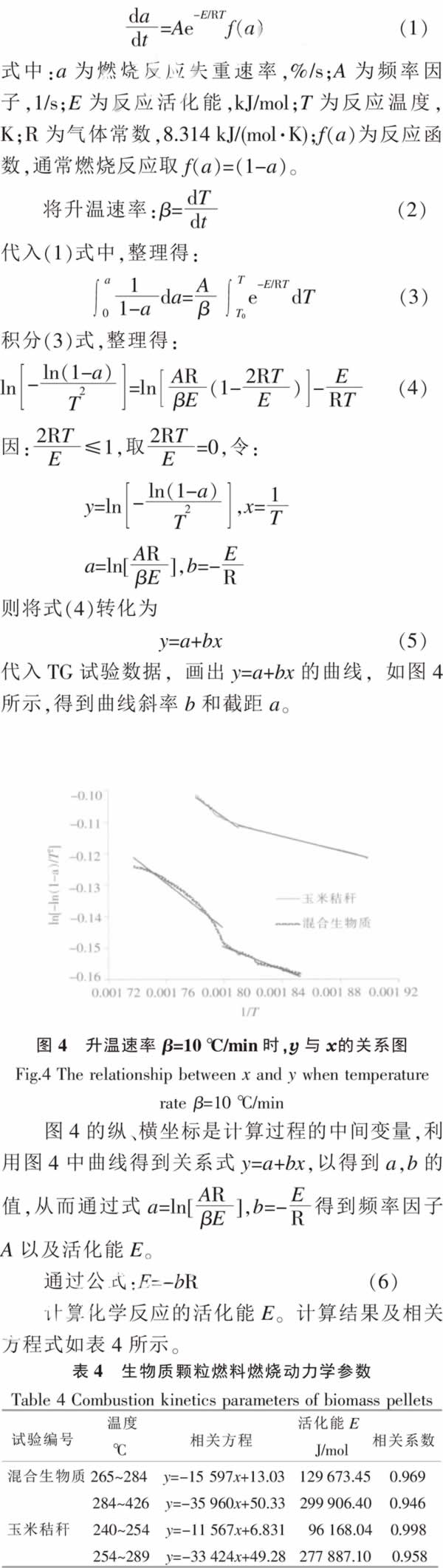 表中參數(shù)說明:TS為揮發(fā)分初始析出溫度,℃;Tmax為最大失重溫度,℃;TV為揮發(fā)分熱解、燃燒結(jié)束溫度,℃;Tf為燃燒基本結(jié)束溫度,℃;Tb燃燒全過程溫度范圍,℃;V∞為燃盡率,%;(dm/dt)max為揮發(fā)分最大失重速率,%/min。 為了便于分析,在圖表中引用了在同一熱重實(shí)驗(yàn)臺(tái)上做的玉米秸稈顆粒的熱重試驗(yàn)數(shù)據(jù)[12],成型條件一致。由于顆粒燃料在成型時(shí)表觀水分已經(jīng)揮發(fā)掉,其內(nèi)部水分隨溫度的升高緩慢析出,因此TG曲線和DTG曲線沒出現(xiàn)水分揮發(fā)的峰值。 由表1可知,生物質(zhì)顆粒中碳含量很少,僅為1.49%~2.52%,揮發(fā)分大量析出、燃燒,使炭粒充分接觸空氣中的氧和獲得熱量,焦炭的燃燒是連續(xù)進(jìn)行的,故TG曲線和DTG曲線沒出現(xiàn)碳燃燒的峰值;生物質(zhì)顆粒燃料的TG曲線和DTG曲線是單峰值的。 表3和圖2、圖3的試驗(yàn)數(shù)據(jù)顯示,混合生物質(zhì)顆粒的揮發(fā)分熱解、燃燒失重峰比玉米秸稈顆粒的揮發(fā)分熱解、燃燒失重峰向右偏移,溫度提高29℃左右,峰值高度減小近50%,燃燒維持的溫度范圍增大約300%。這一結(jié)果說明,玉米秸稈顆粒揮發(fā)分析出溫度較低,并且揮發(fā)分析出時(shí)即刻燃燒,前期揮發(fā)分燃燒速度很快,揮發(fā)分燃燒溫度集中在233~289℃內(nèi);混合生物質(zhì)顆粒的揮發(fā)分析出溫度較玉米秸稈顆粒的揮發(fā)分析出溫度高27℃,前期揮發(fā)分燃燒速度也比較快,達(dá)到最大值后減緩下來,燃燒持續(xù)溫度范圍較寬,在260~426℃內(nèi)。 3混合生物質(zhì)顆粒的燃燒機(jī)理、動(dòng)力學(xué)特性分析 燃燒反應(yīng)動(dòng)力學(xué)是化學(xué)反應(yīng)中的一個(gè)分支,也遵循著化學(xué)反應(yīng)的經(jīng)典公式———阿累尼烏斯公式[13]~[15]: