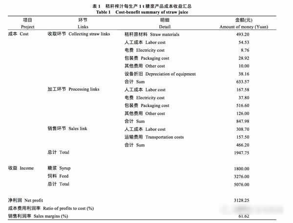 隨著全球經(jīng)濟戰(zhàn)略性結(jié)構(gòu)調(diào)整以及能源安全問題日益突出,生物質(zhì)能源的戰(zhàn)略地位得到空前提升,承載著能源安全、環(huán)境質(zhì)量和農(nóng)民收入等復(fù)雜而重要的多重戰(zhàn)略目標(biāo)。近年來,我國玉米年均種植面積達(dá)到0.36億公頃,玉米秸稈年均產(chǎn)量達(dá)到2.54億噸(數(shù)據(jù)來自:國家統(tǒng)計局網(wǎng)站),東北地區(qū)作為玉米主產(chǎn)區(qū),秸稈資源十分豐富。但是目前隨著秸稈薪炭替代資源增多、收儲成本攀升,不少農(nóng)民隨意丟棄秸稈、焚燒秸稈;玉米秸稈短期生物量大且集中的收獲特性、東北地區(qū)氣溫低不易腐解的地理特性、農(nóng)民秸稈還田技術(shù)和設(shè)備的局限性,使得秸稈直接還田效率大打折扣。因此保證秸稈薪炭、還田的數(shù)量和效率基礎(chǔ)上,積極開發(fā)玉米秸稈低成本、高質(zhì)量收貯模式,有效提高玉米秸稈資源化利用水平,既能夠增加玉米生產(chǎn)收益,延長產(chǎn)業(yè)鏈,帶動加工、制造等產(chǎn)業(yè)升級,也在一定程度上補充能源、飼料等行業(yè)需求,促進(jìn)我國農(nóng)業(yè)可持續(xù)發(fā)展。 干藏法和濕藏法是儲藏玉米秸稈等木質(zhì)纖維素生物質(zhì)中兩種最常見的做法。干藏法需要待儲藏的玉米秸稈等生物質(zhì)水分含量低于25%。如果收獲的時候含水量高于25%,必須先干燥再堆放,主要利用模式有秸稈直燃發(fā)電、制作壓縮板材等。濕藏法收獲含水量大于45%的玉米秸稈等原材料,經(jīng)粉碎混合,將其青貯或用氣密袋包裝以長期儲藏。雖然干藏法在運輸物流上有一定優(yōu)勢,但是易導(dǎo)致干物質(zhì)損失、游離糖分流失,浪費秸稈中農(nóng)業(yè)灌溉投入的寶貴淡水資源。而濕藏法中新型模式——玉米秸稈榨汁收貯模式恰恰彌補了這些缺點。 干玉米秸稈中纖維素含量為40%~55%、半纖維素含量為10%~25%、木質(zhì)素含量為20%~30%。但收獲期的鮮玉米秸稈含水最多,約為55%~75%,含可溶性固形物(90%以上為糖)約為6%~15%,其他為纖維素、半纖維素和木質(zhì)素等。研究表明,平均籽粒單產(chǎn)為9000kg/hm的玉米鮮秸稈產(chǎn)量約30000kg,其中理論上經(jīng)榨汁可得汁液量60%,每公頃可獲得糖約1800kg。這些糖主要是果糖、葡萄糖等可發(fā)酵糖,可用于工業(yè)發(fā)酵,生產(chǎn)多種能源化工產(chǎn)品,比如生產(chǎn)燃料乙醇、燃料丁醇、乳酸、乙酸、乙烯等。經(jīng)過榨汁的玉米秸稈榨渣細(xì)小、柔軟、干燥,便于打包儲存,遠(yuǎn)距離運輸,并可用于飼料、建材等多種用途。因此,本研究分析玉米秸稈榨汁收貯模式的成本和收益,以促進(jìn)玉米秸稈高效收貯產(chǎn)業(yè)化應(yīng)用。 1材料與方法 1.1玉米秸稈榨汁收貯模式 1.1.1試驗地點內(nèi)蒙古自治區(qū)鄂爾多斯市(準(zhǔn)格爾旗)十二連城柴登村 1.1.2儀器設(shè)備經(jīng)過改良的牧神4YZB-7自走式玉米聯(lián)合收割機,魯宇重工926輪式裝載機,HGSSYZ-300雙螺旋秸稈壓榨機,YKJ-5552全自動玉米秸稈打捆打包機,WP110-3/140威普無油靜音空壓機,標(biāo)準(zhǔn)工業(yè)糖漿密封儲罐。 1.1.3試驗方法利用聯(lián)合收割機在收獲玉米穗的同時將粉碎的玉米秸稈一并收集起來,通過壓榨把秸稈中的部分水分脫除,進(jìn)而將榨汁濃縮、儲存?zhèn)溆?同時將榨渣壓塊。 1.2玉米秸稈榨汁收貯資源化利用模式的成本和收益分析 采用經(jīng)濟學(xué)和管理學(xué)中基本的應(yīng)用分析方法——成本效益法,測算玉米秸稈榨汁收貯模式中各環(huán)節(jié)相應(yīng)的成本費用與所產(chǎn)生的利益,匯總求得凈利潤、成本費用收益率及成本收益率等相關(guān)經(jīng)濟指標(biāo)數(shù)值,旨在分析玉米秸稈榨汁收貯模式——利益與利潤的基礎(chǔ)上,評估該模式的資源化水平。 2結(jié)果與分析 2.1玉米秸稈榨汁收貯模式 在玉米正常成熟后,將果穗與莖稈同步收獲;通過壓榨脫水,將榨汁濃縮成含糖50%的糖漿罐裝存貯;同時將榨渣在25.00~30.00MPa壓力下壓實打包,形成榨渣壓塊,作為制取纖維素乙醇原料及真空包裝的微貯秸稈飼料。 2.2榨汁收貯模式成本收益分析 2.2.1玉米秸稈收取與流通環(huán)節(jié) 在玉米秸稈收取環(huán)節(jié),采用經(jīng)過改良的牧神4YZB-7自走式玉米聯(lián)合收割機(改良后可以在收獲玉米穗的同時將玉米秸稈不落地回收),據(jù)對該地區(qū)多地實地調(diào)研可得每公頃玉米產(chǎn)量約為9000kg左右,按照草谷比1.0∶1.2估算,玉米秸稈約為10800kg/hm。公司主要實行收割機外包制度,目前共有3臺收割機全部下包給農(nóng)戶,由農(nóng)戶自行負(fù)責(zé)維護、保養(yǎng)費用,雇傭司機費用等,每臺收割機大概收20t秸稈,并且公司規(guī)定每臺收割機每天至少往工廠送草20t。公司實行秸稈補貼政策,對于農(nóng)戶,每噸秸稈補貼包機農(nóng)戶30元,即支出為30元每t。 在玉米的流通環(huán)節(jié),從收集秸稈的玉米地到工業(yè)基地的平均運輸成本約為30元/t,每車秸稈載重量為3.00t,按照每天最低標(biāo)準(zhǔn)秸稈輸送量計算,3臺收割機共輸送秸稈60t,約為1800元/d。由于司機由包機農(nóng)戶自己雇傭,所以在人工成本上忽略不計。 2.2.2玉米秸稈榨汁加工環(huán)節(jié) 在秸稈榨汁加工環(huán)節(jié),采用HGSSYZ-300雙螺旋秸稈壓榨機和WP110-3/140威普無油靜音空壓機壓榨,每1kg秸稈經(j
