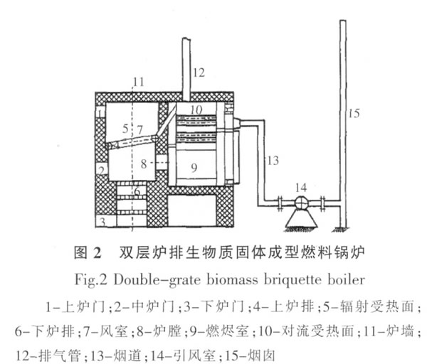 燃燒器工作時(shí),由自控系統(tǒng)進(jìn)行控制,點(diǎn)火系統(tǒng)和配風(fēng)系統(tǒng)配合將燃料點(diǎn)燃,進(jìn)料系統(tǒng)持續(xù)進(jìn)料,配風(fēng)系統(tǒng)鼓風(fēng),清渣系統(tǒng)及時(shí)清除灰渣,使得燃料在燃燒室內(nèi)持續(xù)、高效燃燒。 由于燃燒器的各個(gè)輸入變量是獨(dú)立的,且可以通過(guò)控制相應(yīng)的電機(jī)來(lái)精確控制變量值,同時(shí)在燃燒器和配套鍋爐內(nèi)安置火焰?zhèn)鞲衅骱蜏囟葌鞲衅?,可以?duì)點(diǎn)火、燃燒狀態(tài)進(jìn)行較為精確的監(jiān)測(cè)并反饋到控制系統(tǒng)中,進(jìn)行判斷,因果關(guān)系更加明確。燃燒器可實(shí)現(xiàn)自動(dòng)控制,連續(xù)燃燒,但其結(jié)構(gòu)較為復(fù)雜、價(jià)格昂貴。另外,此類(lèi)燃燒器僅適用于顆粒燃料,壓塊燃料由于體積較大,不適用于均勻進(jìn)料的燃燒設(shè)備。 在我國(guó),針對(duì)以秸稈為原料生產(chǎn)的成型燃料灰含量高、易結(jié)渣等問(wèn)題,農(nóng)業(yè)部規(guī)劃設(shè)計(jì)研究院研究開(kāi)發(fā)的秸稈固體成型燃料燃燒器,采用雙層燃燒筒裝置,實(shí)現(xiàn)三級(jí)配風(fēng),添加螺旋清灰破渣機(jī)構(gòu),提高了燃燒效率,減少了污染物排放[14]。 1.2成型燃料爐排燃燒設(shè)備 國(guó)內(nèi)成型燃料燃燒器主要以爐排式生物質(zhì)鍋爐為主,應(yīng)用面較廣,但是自動(dòng)化水平不高?,F(xiàn)在最常見(jiàn)的是手燒爐排式鍋爐,操作簡(jiǎn)單,燃料種類(lèi)適用性廣,壓塊和顆粒燃料均可。圖2所示為河南農(nóng)業(yè)大學(xué)研發(fā)的雙層爐排生物質(zhì)固體成型燃料鍋爐[15]。