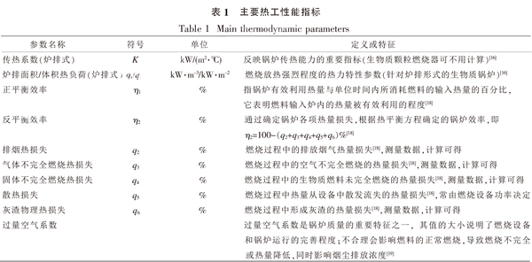 生物質(zhì)固體成型燃料在爐排上燃燒,上爐排的生物質(zhì)屑和灰渣漏到下?tīng)t排上繼續(xù)燃燒直至燃燼。成型燃料在上爐排燃燒形成的煙氣和部分可燃?xì)怏w透過(guò)燃料和灰渣進(jìn)入上、下?tīng)t排間的爐膛進(jìn)行燃燒,并與下?tīng)t排燃料產(chǎn)生的煙氣一起,通過(guò)出煙口流向燃燼室和對(duì)流受熱面。爐排的燃燒方式,實(shí)現(xiàn)了生物質(zhì)固體成型燃料的分步燃燒,緩解了生物質(zhì)燃燒速度,達(dá)到燃燒需氧與供氧的匹配,使生物質(zhì)固體成型燃料可以持續(xù)穩(wěn)定燃燒[16],[17]。 但是整個(gè)燃燒設(shè)備沒(méi)有自動(dòng)控制設(shè)備,也未安裝監(jiān)控系統(tǒng),且污染物排放量較大,與國(guó)外的相關(guān)產(chǎn)品還有很大差距。 2燃燒設(shè)備的監(jiān)測(cè)指標(biāo)和標(biāo)準(zhǔn) 生物質(zhì)固體成型燃料燃燒設(shè)備的燃燒情況優(yōu)劣,需要明確監(jiān)測(cè)指標(biāo),根據(jù)標(biāo)準(zhǔn)進(jìn)行評(píng)判。目前,國(guó)內(nèi)并沒(méi)有針對(duì)生物質(zhì)成型燃燒設(shè)備的燃燒測(cè)試標(biāo)準(zhǔn),一般可參考《工業(yè)鍋爐熱工性能試驗(yàn)規(guī)程(GB 10180-2003)》和《鍋爐大氣污染物排放標(biāo)準(zhǔn)(GB 13271-2001)》,主要從熱工性能方面,判斷生物質(zhì)固體成型燃料燃燒設(shè)備的燃燒性能以及煙氣排放污染物排放等。 2.1熱工性能檢測(cè)指標(biāo) 針對(duì)生物質(zhì)固體成型燃料的特性,可選取主要熱工性能指標(biāo)如表1所示。