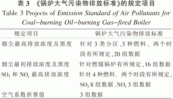 生物質(zhì)顆粒燃燒還會(huì)排放出煙塵。煙塵的主要組成部分是生物質(zhì)固體成型燃料中的灰分和未完全燃燒產(chǎn)物中的細(xì)小顆粒[21]。2011年11月,北京持續(xù)的灰霾天氣,引起了公眾對(duì)PM2.5(細(xì)顆粒物,直徑小于或等于2.5μm)的重視。PM2.5的主要來(lái)源是人為排放,其中燃燒釋放的煙塵為重要因素,SO2和NOx亦可以轉(zhuǎn)化為PM2.5[22]。PM2.5濃度高會(huì)影響大氣能見(jiàn)度,造成灰霾天氣[23],對(duì)人體呼吸系統(tǒng)和心血管系統(tǒng)造成傷害[24]。而生物質(zhì)固體成型燃料的燃燒會(huì)釋放大量的細(xì)小顆粒物,因此對(duì)煙塵的監(jiān)測(cè)則非常必要。 大氣污染物排放監(jiān)控重點(diǎn)在于使用高靈敏度的儀器測(cè)量CO2,CO,NO,NO2和煙塵排放量,參照國(guó)家標(biāo)準(zhǔn),對(duì)比其排放差距。表3為《鍋爐大氣污染物排放標(biāo)準(zhǔn)GB 13271-2001》的規(guī)定項(xiàng)目[25]的總結(jié),從表中可知,該標(biāo)準(zhǔn)規(guī)定的項(xiàng)目和數(shù)據(jù)均較少,遠(yuǎn)不能涵蓋鍋爐的煙塵、煙氣排放的種類(lèi),不能滿(mǎn)足環(huán)境管理和環(huán)境質(zhì)量控制的要求。