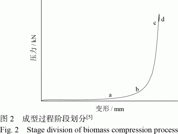 1成型過程 成型過程中,根據(jù)原料變形原因,可分四個(gè)階段[3-5],見圖2。a為松散階段,以克服原料間空隙為主,原料中空氣在一定程度上被排除,壓力與變形呈線性關(guān)系,較小的壓力增大可獲得較大的變形增量。b為過渡階段,壓力增大,大顆粒破裂成小粒子,發(fā)生彈性變形并占主導(dǎo)地位,粒子內(nèi)部空隙被填補(bǔ),壓力與變形呈指數(shù)關(guān)系。c為壓緊階段,原料主要發(fā)生塑性變形,粒子在變形中斷裂或發(fā)生滑移:垂直主應(yīng)力方向,粒子充分延展,靠嚙合方式緊密結(jié)合;平行主應(yīng)力方向,粒子變薄,靠貼合方式緊密結(jié)合。燃料基本成型,壓力與原料塑性變形有關(guān)。d為推移階段,原料發(fā)生塑性和彈黏性變形,以彈黏性變形為主。原料發(fā)生應(yīng)力松弛和蠕變等現(xiàn)象,壓力會(huì)顯著下降。