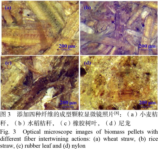 2粒子結(jié)合方式 KALIYAN等[6]對(duì)成型燃料粒子間結(jié)合方式進(jìn)行了總結(jié),提出兩種理論:①粒子間距離足夠近,靠吸引力結(jié)合。成型過程中,由于粒子間或內(nèi)部摩擦而產(chǎn)生的靜電吸引力,能夠使粒子相互結(jié)合。當(dāng)粒子間距離小于0.1μm時(shí),范德華力成為粒子間結(jié)合的主要吸引力。②粒子間靠“固體橋”結(jié)構(gòu)結(jié)合。 原料中的一些物質(zhì)或添加劑,因化學(xué)反應(yīng)、結(jié)晶或固化作用,粒子間接觸時(shí)互相擴(kuò)散形成交叉結(jié)合,從而形成“固體橋”結(jié)構(gòu),成為粒子間結(jié)合的主要方式。KALIYAN等的研究證實(shí),玉米秸稈和柳枝稷本身中的木質(zhì)素、碳水化合物、淀粉、蛋白質(zhì)和脂肪等發(fā)生軟化或變形,能形成“固體橋”結(jié)構(gòu)。KONG等[7]經(jīng)研究證實(shí),鋸末成型時(shí)加入廢棄包裝紙纖維可形成“固體橋”結(jié)構(gòu),具有更好的機(jī)械耐久性。 KONG等[8]進(jìn)一步研究了添加水稻秸稈、小麥秸稈、橡膠樹葉、尼龍四種纖維對(duì)鋸末成型的影響,見圖3,發(fā)現(xiàn)水稻秸稈、橡膠樹葉對(duì)改善顆粒物理品質(zhì)起到促進(jìn)作用,因?yàn)樗窘斩?、橡膠樹葉和鋸末同屬親水性原料,粒子間能夠有效互相纏繞,形成“固體橋”結(jié)構(gòu)。小麥秸稈、尼龍屬疏水性原料,對(duì)改善顆粒品質(zhì)起消極作用。