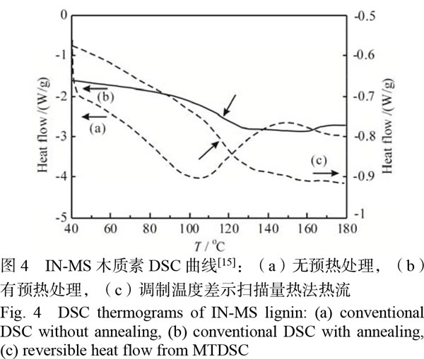 3木質(zhì)素黏結(jié)作用 3.1熱轉(zhuǎn)變特性 生物質(zhì)是一種天然高分子聚合物,其熱轉(zhuǎn)變特性指玻璃態(tài)轉(zhuǎn)變溫度(Tg)和熔融溫度。玻璃態(tài)轉(zhuǎn)變溫度是指聚合物軟化,從玻璃態(tài)向塑性態(tài)轉(zhuǎn)變的溫度。聚合物由分子量和鏈長(zhǎng)不同的結(jié)構(gòu)單體組成,玻璃態(tài)轉(zhuǎn)變發(fā)生在一個(gè)溫度區(qū)間內(nèi),是聚合物的一種重要特性。熔融溫度是指聚合物由固態(tài)向液態(tài)轉(zhuǎn)變的溫度。木質(zhì)素的熱轉(zhuǎn)變特性在成型過程中起關(guān)鍵作用。在玻璃態(tài)轉(zhuǎn)變溫度以下,由于價(jià)鍵和次價(jià)鍵所形成的內(nèi)聚力,表現(xiàn)出較高的力學(xué)強(qiáng)度,有較大的彈性模量;在玻璃態(tài)轉(zhuǎn)變溫度以上,木質(zhì)素分子部分轉(zhuǎn)動(dòng)或位移逐漸變成分子的熱膨脹運(yùn)動(dòng),流動(dòng)性增強(qiáng),有較大的黏度[9]。木質(zhì)素的玻璃態(tài)轉(zhuǎn)變溫度取決于其來源,與種類、水分含量、提取過程有關(guān)[10-11]。STELTE等[12]的研究表明,硬木木質(zhì)素存在較多乙酰基、甲氧基結(jié)構(gòu)和少量的酚羥基結(jié)構(gòu),其玻璃態(tài)轉(zhuǎn)變溫度低于軟木[12]。STELTE等[13]研究了小麥秸稈玻璃態(tài)轉(zhuǎn)變溫度對(duì)成型顆粒的影響。水分含量為8%時(shí),小麥秸稈和經(jīng)正己烷提取后的小麥秸稈的玻璃態(tài)轉(zhuǎn)變溫度分別為53℃和63℃,在玻璃態(tài)轉(zhuǎn)變溫度以下(30℃)與以上(100℃)比較時(shí),顆粒密度和強(qiáng)度較低,軸向延伸較大。 KALIYAN等[14]采用差示掃描量熱法(DSC)測(cè)定了不同水分下玉米秸稈和柳枝稷的玻璃態(tài)轉(zhuǎn)變溫度,結(jié)果見表1,發(fā)現(xiàn)水分增加會(huì)使玻璃態(tài)轉(zhuǎn)變溫度降低,因?yàn)樗帜艹洚?dāng)塑性劑,木質(zhì)素–木質(zhì)素分子間的氫鍵聯(lián)結(jié)部分被木質(zhì)素–水聯(lián)接所代替。LI等[15]采用DSC、調(diào)制溫度差示掃描量熱法(TMDSC)、熱機(jī)械法(TMA)和流變儀法(Rheology)測(cè)試了三種工業(yè)木質(zhì)素的玻璃態(tài)轉(zhuǎn)變溫度。采用DSC測(cè)試時(shí),發(fā)現(xiàn)直接對(duì)樣品進(jìn)行程序升溫,DSC曲線會(huì)因水分的蒸發(fā)而出現(xiàn)較寬的吸熱峰,造成較大誤差,如圖4所示。因此,必須對(duì)樣品進(jìn)行預(yù)熱處理以蒸發(fā)掉水分同時(shí)消除預(yù)熱歷史,而木質(zhì)素組分對(duì)溫度較為敏感,進(jìn)行預(yù)熱處理時(shí)溫度達(dá)到120℃時(shí)會(huì)帶來熱分解,造成結(jié)構(gòu)的改變[16]。故將預(yù)熱處理的終止溫度設(shè)定為90℃,結(jié)果如表2所示。發(fā)現(xiàn)相比于原始木質(zhì)素和甲醇不溶性成分(MI),甲醇可溶性木質(zhì)素(MS)中含有較少的縮合結(jié)構(gòu),具有較低的玻璃態(tài)轉(zhuǎn)變溫度。