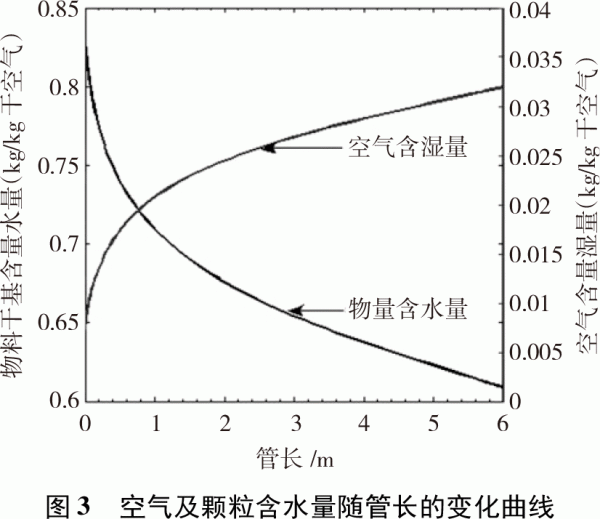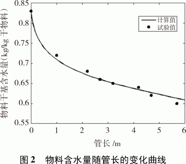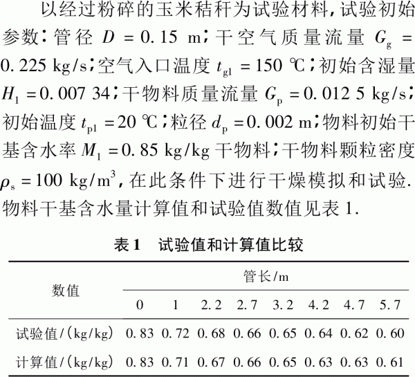 3模型求解和試驗驗證 通過計算機編程,結(jié)合物料物性參數(shù)、空氣和水蒸氣特性參數(shù),在給定初始參數(shù)條件下,采用主程序調(diào)用子函數(shù)(采用ode45函數(shù)[11])來求解方程組,得到生物質(zhì)燃料含水率、空氣含水量等參數(shù)隨管長的變化數(shù)值解,并繪制相關(guān)曲線。