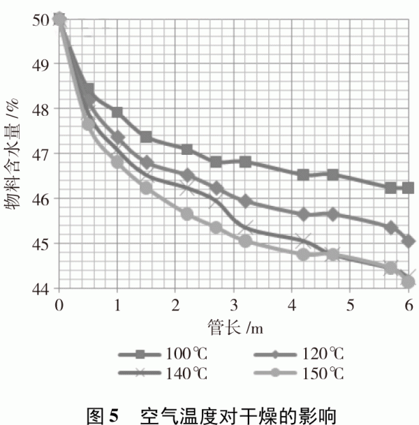 5干燥的影響因素分析 5.1初始含水量對干燥的影響 在空氣溫度140℃,進料量1.5kg/min條件下,按不同初始含水量56%~43%進行氣流干燥試驗,試驗結(jié)果如圖4??梢钥闯龈稍镏饕性诟稍锕艿那岸?,1~2m階段干燥較快,之后干燥較緩慢。在干燥管長度相同的情況下,通過對比可以看出,初始含水量越高達到干燥要求越困難。實際干燥操作時,可以預(yù)先對所要干燥物料在不影響使用的情況下進行必要的晾曬,以求較快達到所需的干燥效果。 5.2空氣溫度對干燥的影響 在試驗臺進料量為1.5kg/min,物料初始含水量50%條件下,按空氣不同進口溫度(100~150℃)進行生物質(zhì)秸稈燃料氣流干燥試驗,試驗結(jié)果如圖5。由曲線可以看出,隨著氣流溫度的升高,干燥速率也隨之增大,干燥效果越好。這是因為空氣溫度的提高,使氣固兩相溫差增大,二者之間的傳熱傳質(zhì)加劇[12]。隨著空氣溫度的提高,生物質(zhì)秸稈顆粒表面水分蒸發(fā)速度加快,內(nèi)部水分?jǐn)U散速度也加快,最終結(jié)果就是干燥速率提高。這說明提高空氣入口溫度有利于干燥的進行。