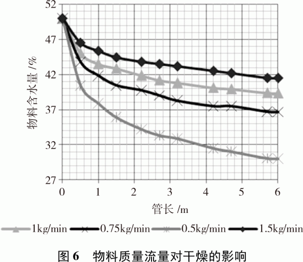 5.3濕物料質(zhì)量流量對干燥的影響 干燥氣流溫度為140℃,物料初始含水量為50%,在僅改變物料質(zhì)量流量的條件下進行試驗。試驗結(jié)果如圖6所示。濕物料質(zhì)量流量的變化即是干燥過程中氣固兩相質(zhì)量比的變化。從圖中可以看出,隨著物料流量的減小,即氣固比的增大,顆粒沿干燥管長度干燥速率增大,顆粒通過干燥器出口時的濕度顯著減少。物料流量減小,意味著更多的熱空氣作為介質(zhì)來移除物料中水分,空氣中可以容納的水蒸氣量也相應(yīng)的增加。但是氣固比過高,會導(dǎo)致排氣溫度過高,使得熱空氣的熱能不能有效地利用,造成能源浪費。而且,較高的氣固比,也會導(dǎo)致氣流和被干燥顆粒速度過快,使得顆粒在干燥管內(nèi)滯留時間變短,也會造成熱量不能夠充分被利用;所以適當(dāng)?shù)臍夤瘫?,有利于提高干燥效果?/p>